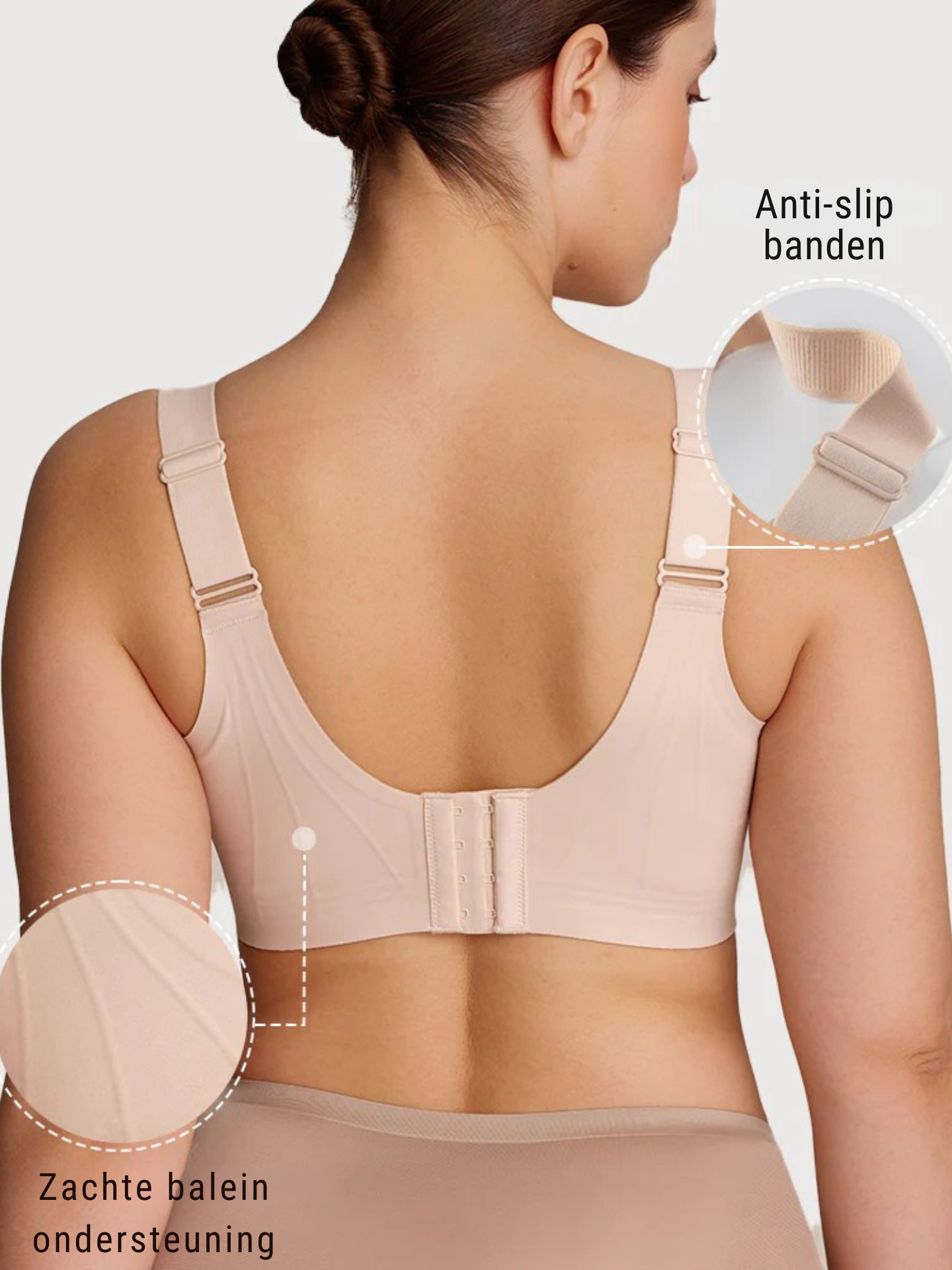 Wat deze BH zo comfortabel maakt, is de brede ondersteunende band die zich zacht rond je lichaam vormt. Hierdoor wordt de druk beter verdeeld en blijft de BH stabiel zitten tijdens het dragen.